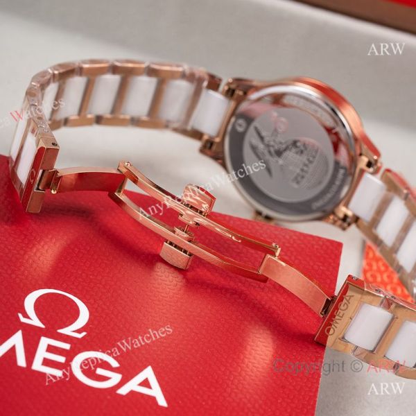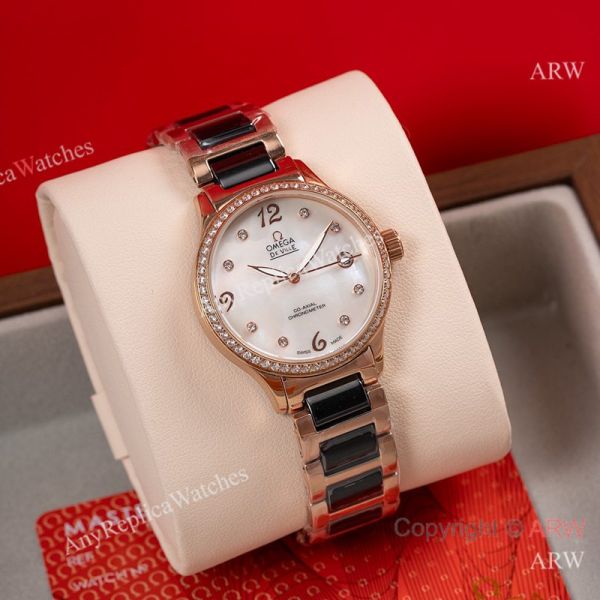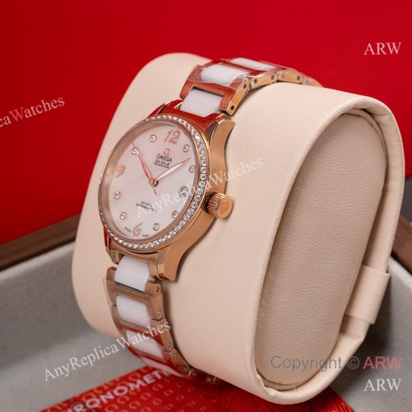 High Quality Replica Omega 2-Tone 316 stainless steel strap White Face Dial White Diamonds Ceramic Bezel Lady Watch 32mm