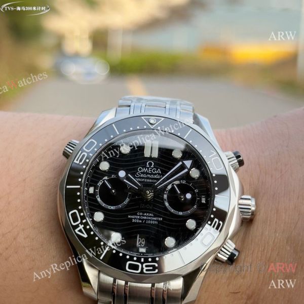 High Quality TVS Factory Replica OMEGA Seamaster Silver Strap Black Face Dial Black Bezel Fashion Watch 44mm
