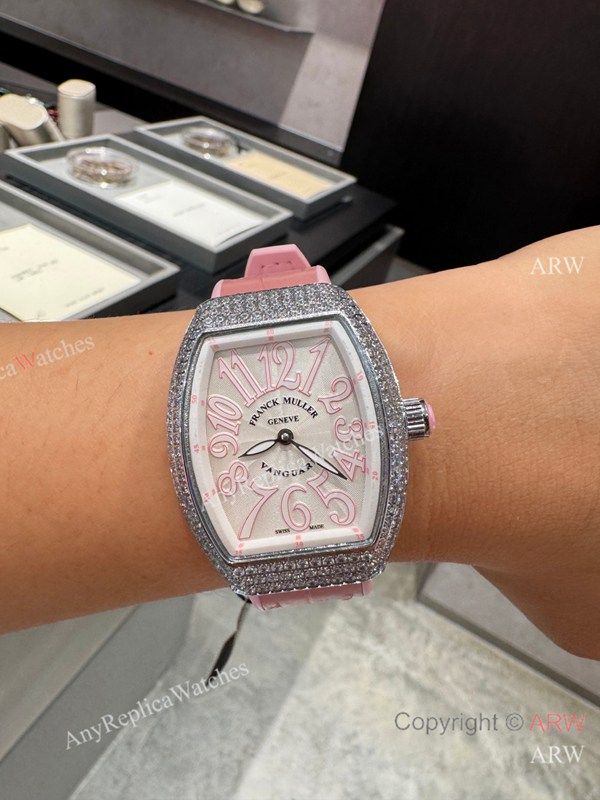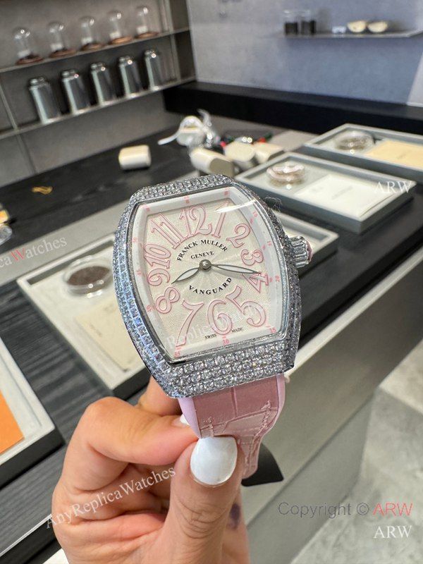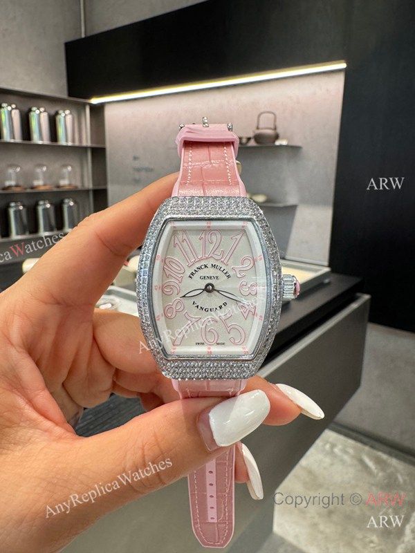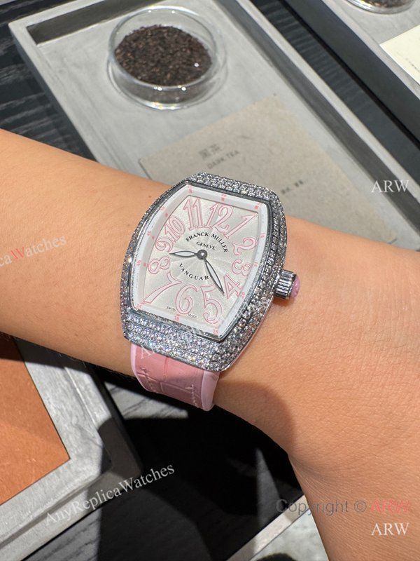 Replica Franck Muller V32 Pink Rubber Strap White Face Dial Diamond-Inlaid Silver Bezel Watch Fashion Size 32mm