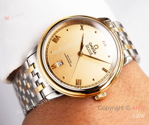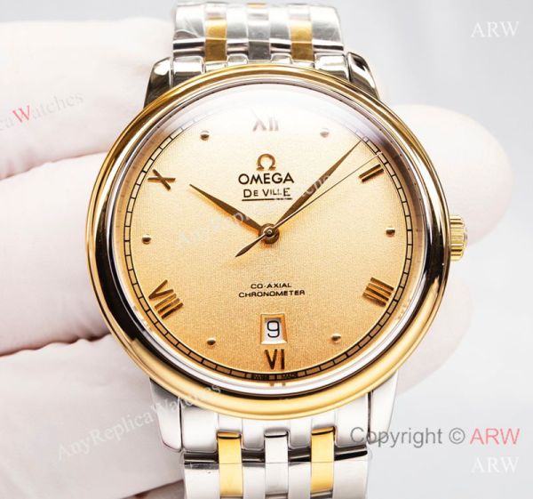 High Quality Replica Omega De Ville Series Couple Italian Leather/Stainless Steel Silver Strap Gold Sunburst Face Dial Gold Stainless Steel Case Watch Different Sizes (39.5mm/32.7mm)