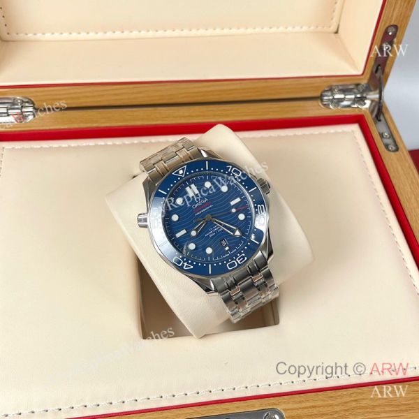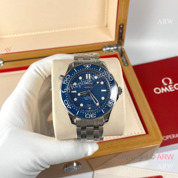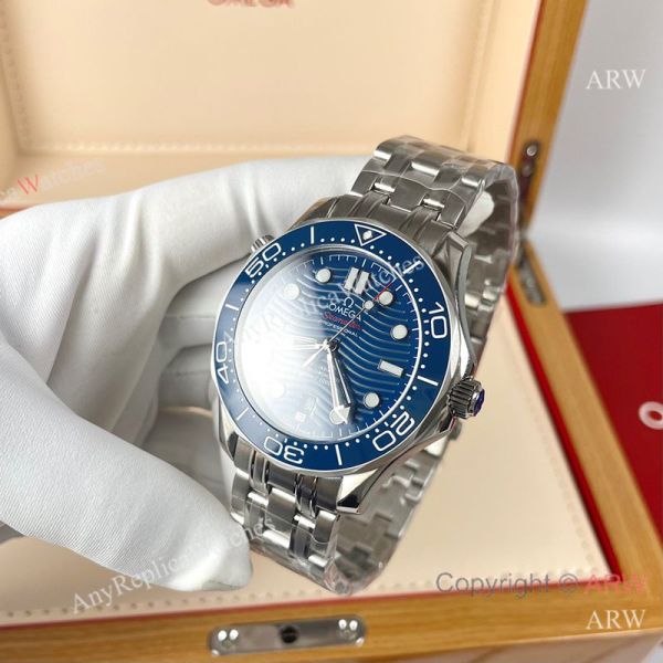 Replica OMEGA Seamaster 300 Different Straps (316 Stainless Steel/Silicone) Blue Wavy Ceramic Face Dial Blue Ceramic Bezel Stainless Steel Case Watch 42mm