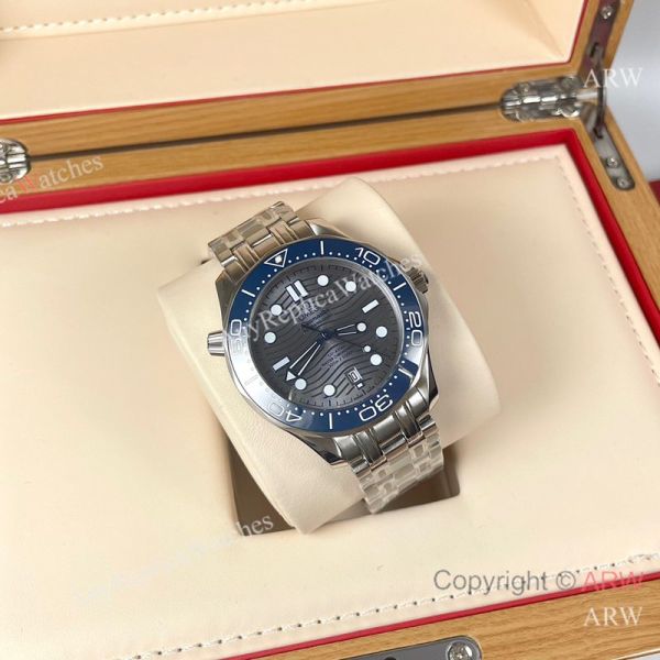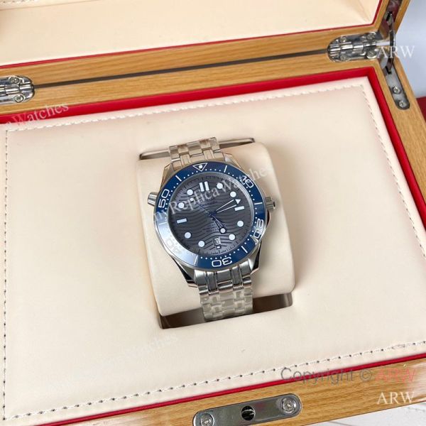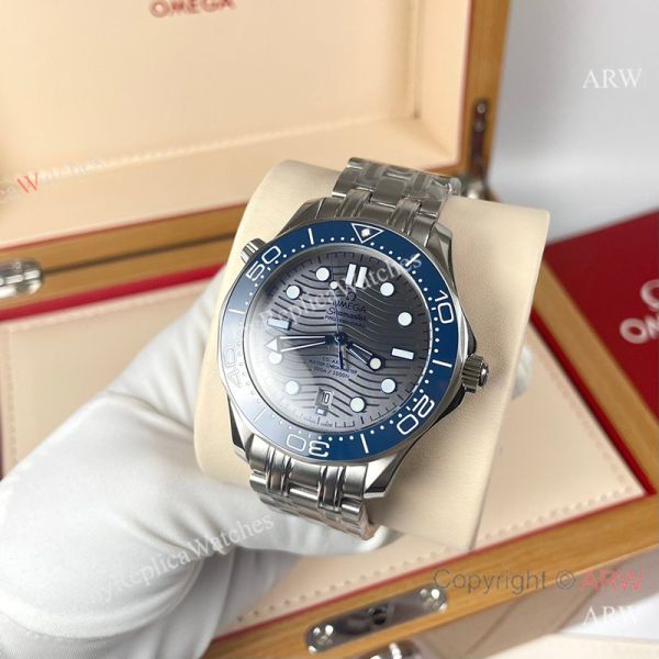 Replica OMEGA Seamaster 300 Different Straps (316 Stainless Steel/Silicone) Grey Wavy Ceramic Face Dial Blue Ceramic Bezel Stainless Steel Case Watch 42mm