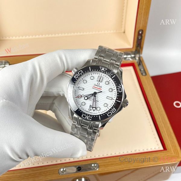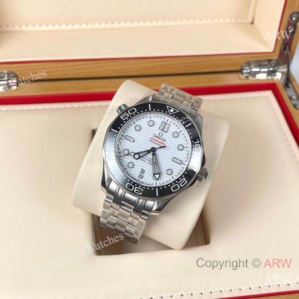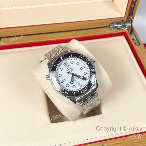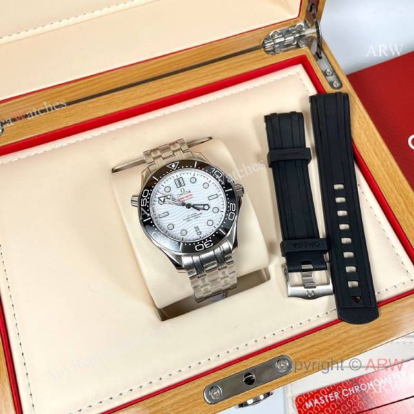 Replica OMEGA Seamaster 300 Different Straps (316 Stainless Steel/Silicone) White Wavy Ceramic Face Dial Black Ceramic Bezel Stainless Steel Case Watch 42mm