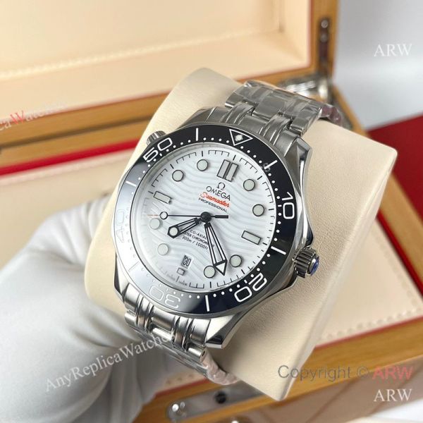 High Quality Replica OMEGA Seamaster 300 Different Straps (316 Stainless Steel/Silicone) White Wavy Ceramic Face Dial Black Ceramic Bezel Stainless Steel Case Watch 42mm
