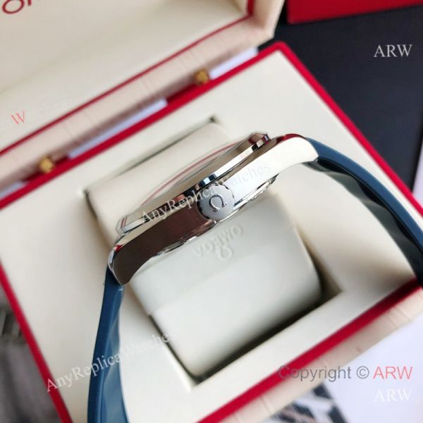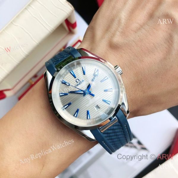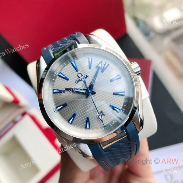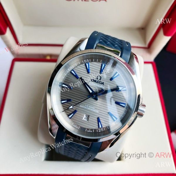 High Quality Replica OMEGA Seamaster Aqua Terra 150M Dark Blue Strap Grey Curved Face Dial Silver Case Watch 41.5mm