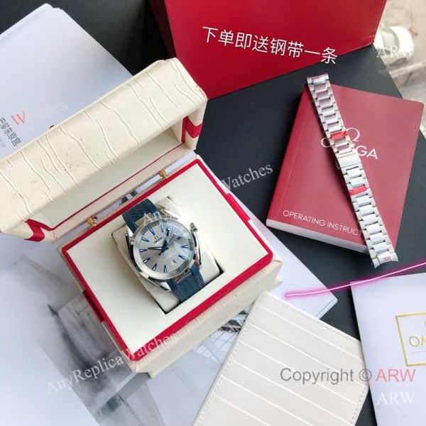 Replica OMEGA Seamaster Aqua Terra 150M Dark Blue Strap Grey Curved Face Dial Silver Case Watch 41.5mm