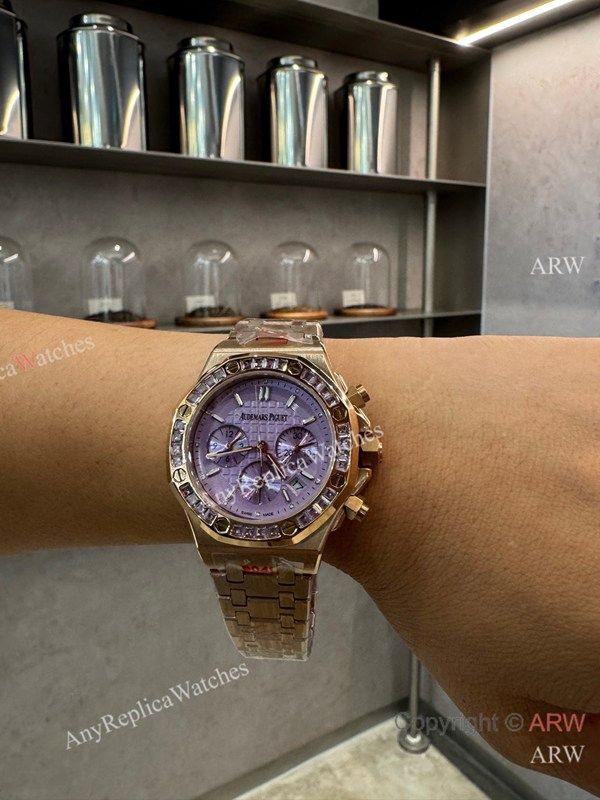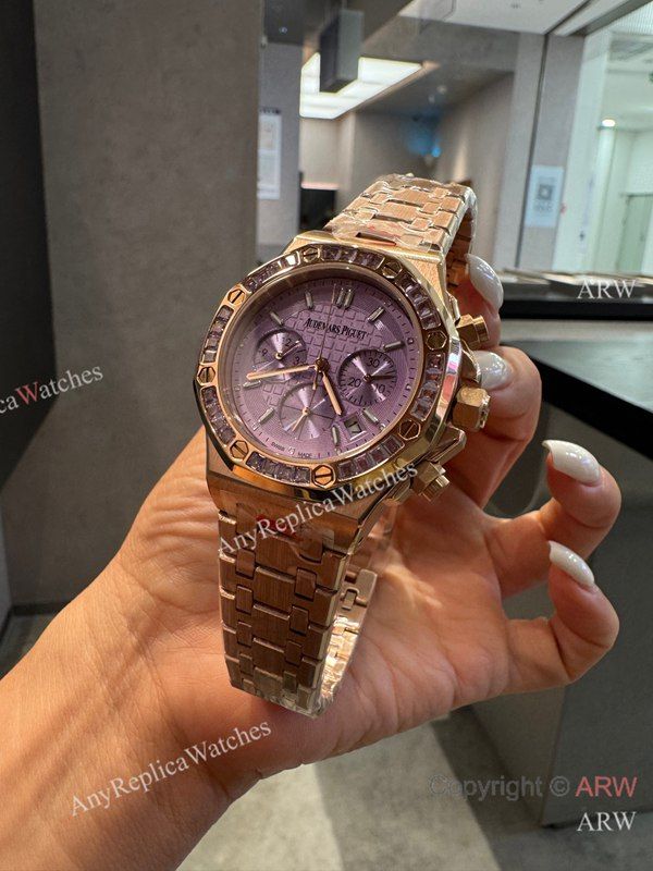 High Quality Replica AUDEMARS PIGUET Royal Oak 26319 Rose Gold 316L Stainless Steel Strap Light purple Face Dial Diamond-Set Octagonal Stainless Steel Bezel Lady Watch 37mm