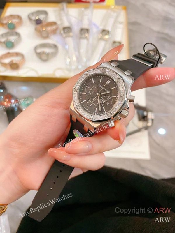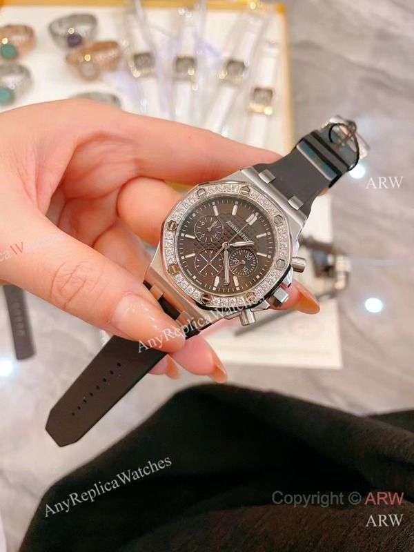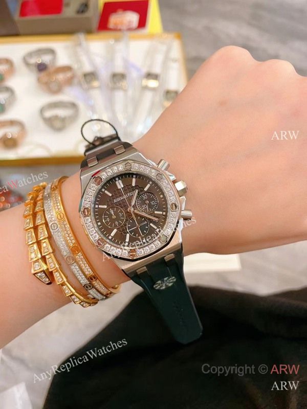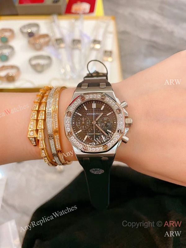 High Quality Replica AUDEMARS PIGUET Royal Oak Black rubber Strap Brown Face Dial Diamond-Set Octagonal Stainless Steel Bezel Lady Watch 37mm