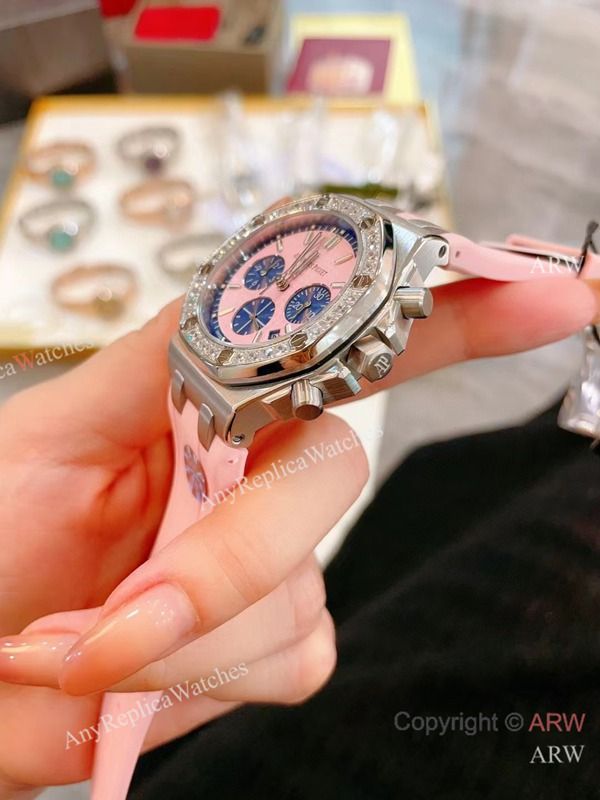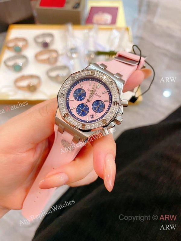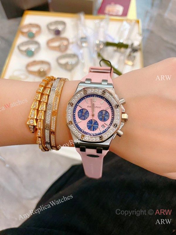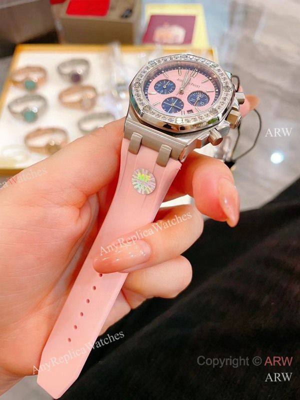 Replica AUDEMARS PIGUET Royal Oak Pink rubber Strap Pink Face Dial Diamond-Set Octagonal Stainless Steel Bezel Watch 37mm