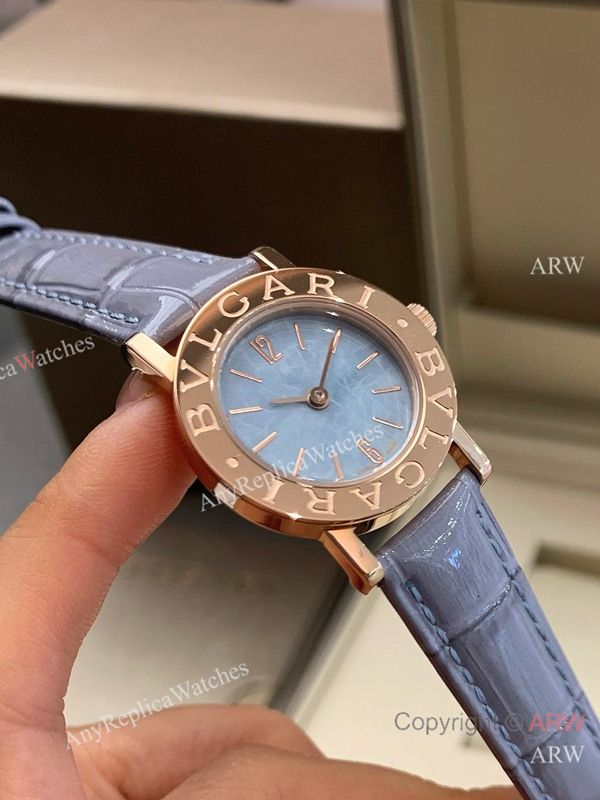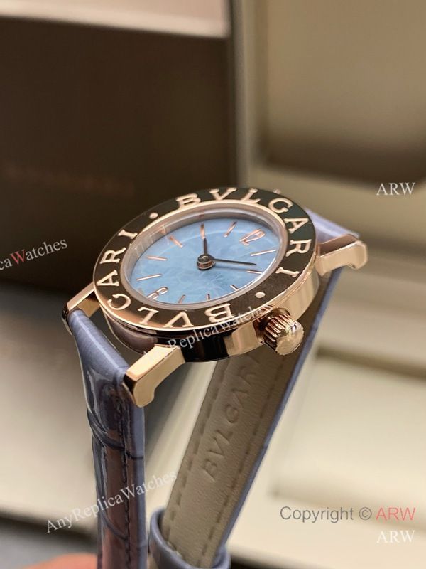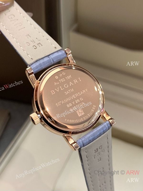 Replica BVLGARI Light purple Full-Grain Leather Strap Light Blue Verde Alpi Marble Mother-Of-Pearl FaceDial 316 Stainless Steel Case Watch 26mm