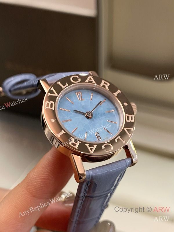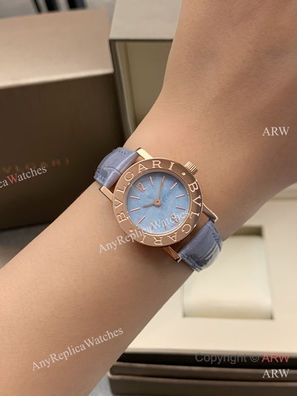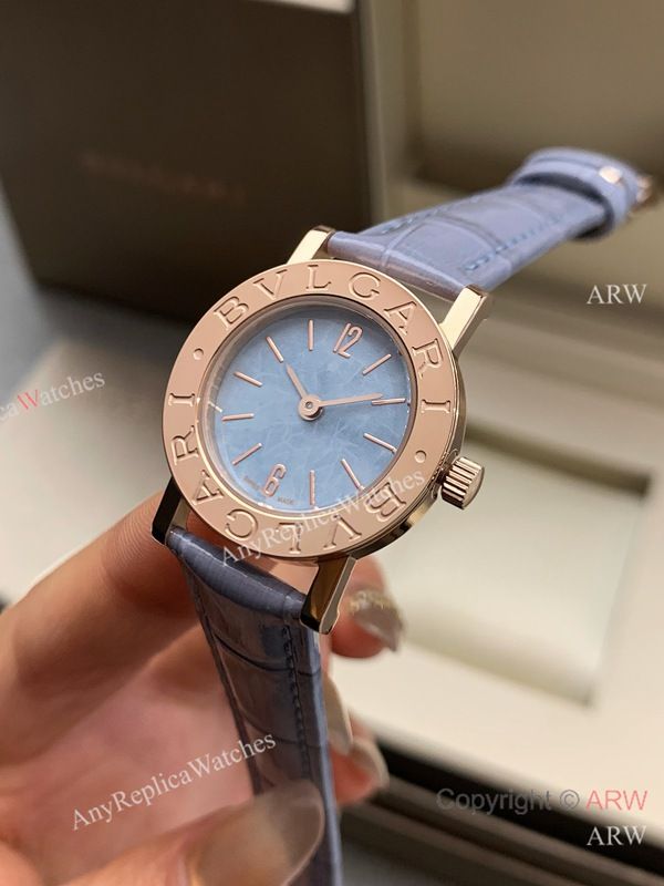 High Quality Replica BVLGARI Light purple Full-Grain Leather Strap Light Blue Verde Alpi Marble Mother-Of-Pearl Face Dial 316 Stainless Steel Case Watch 26mm
