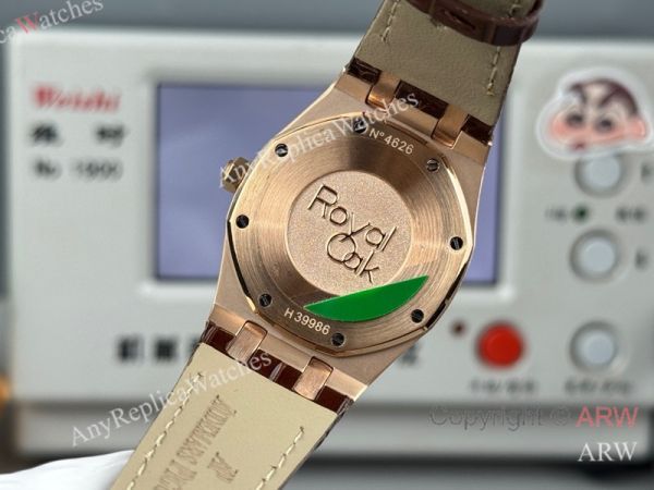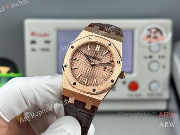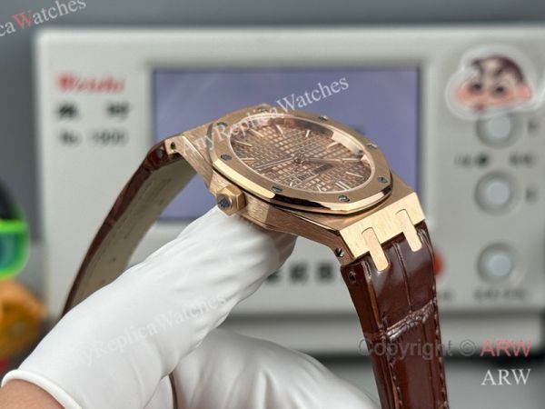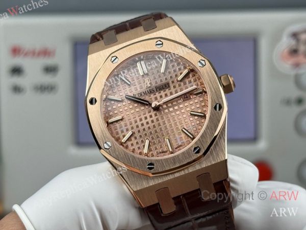 High Quality Replica AUDEMARS PIGUET Royal Oak Brown Leather Strap Rose Gold Grande Tasserie Grid Pattern Face Dial Rose Gold Hexagonal Screw Fixed Case Watch 33mm