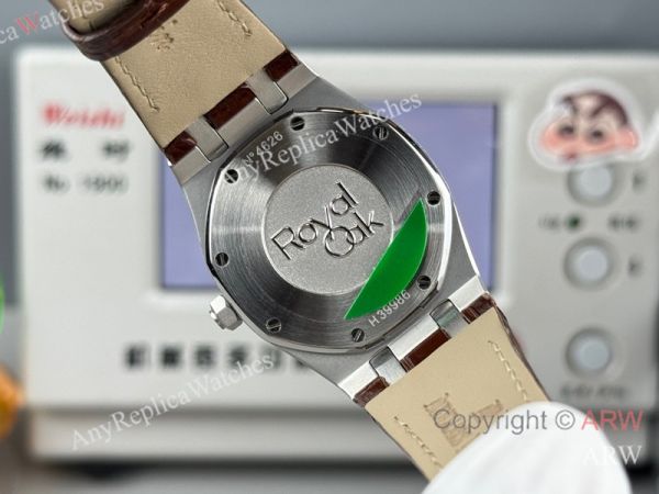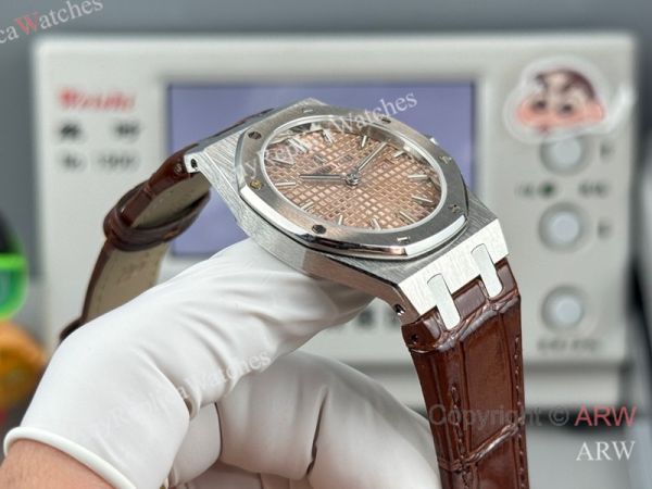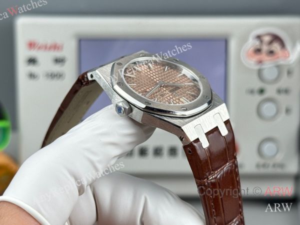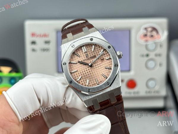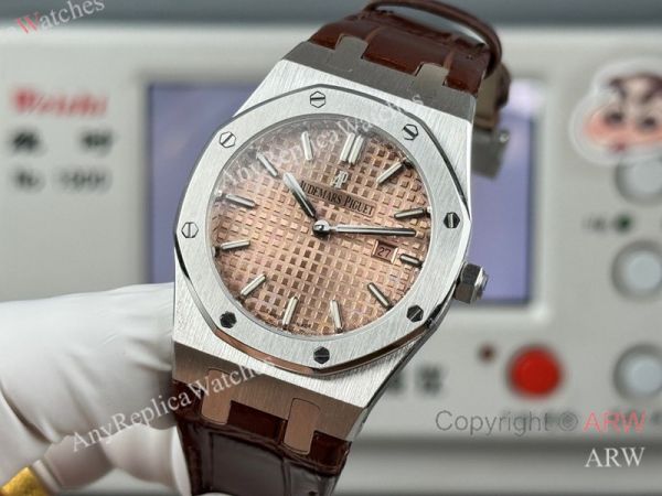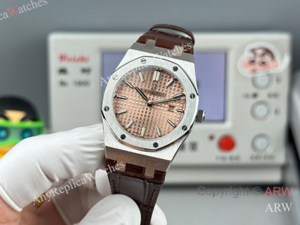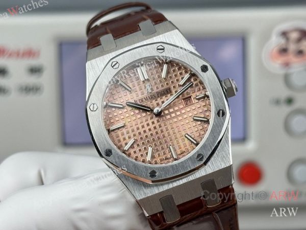 High Quality Replica AUDEMARS PIGUET Royal Oak Brown Leather Strap Rose Gold Grande Tasserie Grid Pattern Face Dial Silver Hexagonal Screw Fixed Case Watch 33mm