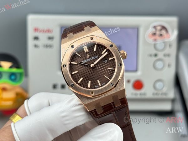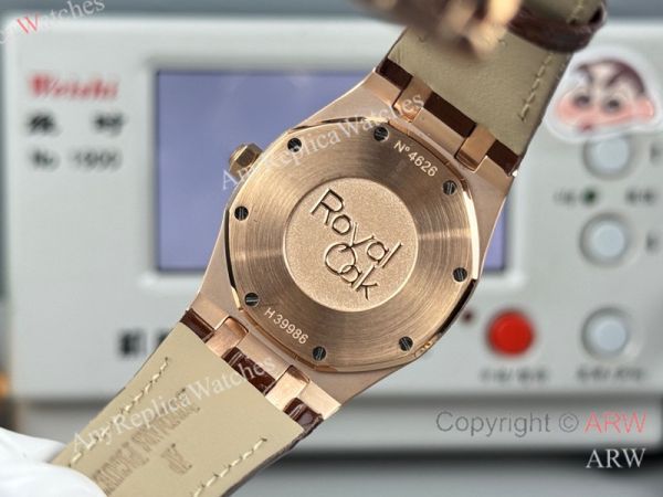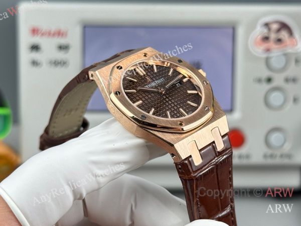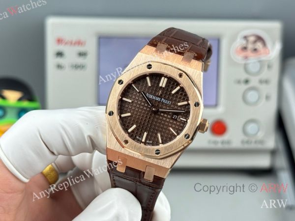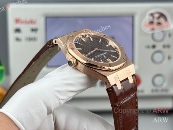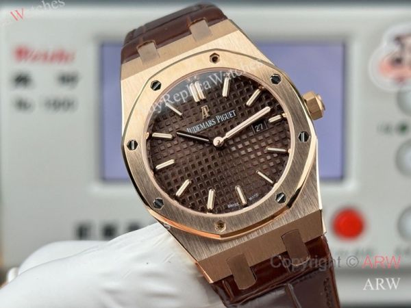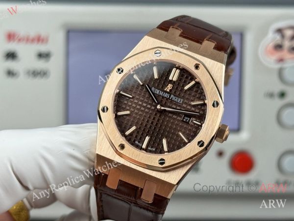 High Quality Replica AUDEMARS PIGUET Royal Oak Brown Leather Strap Brown Grande Tasserie Grid Pattern Face Dial Rose Gold Hexagonal Screw Fixed Case Watch 33mm