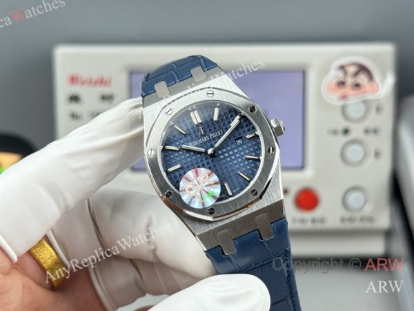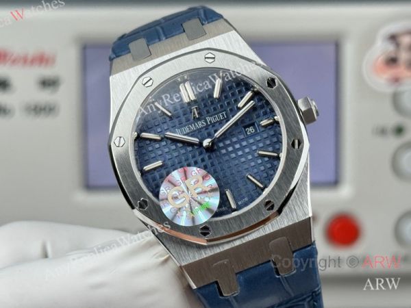 High Quality Replica AUDEMARS PIGUET Royal Oak Dark Blue Leather Strap Dark Blue Grande Tasserie Grid Pattern Face Dial Silver Hexagonal Screw Fixed Case Watch 33mm