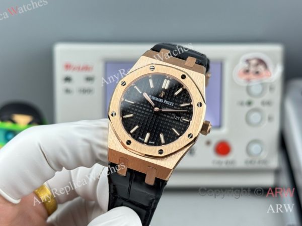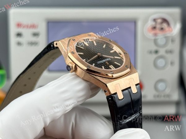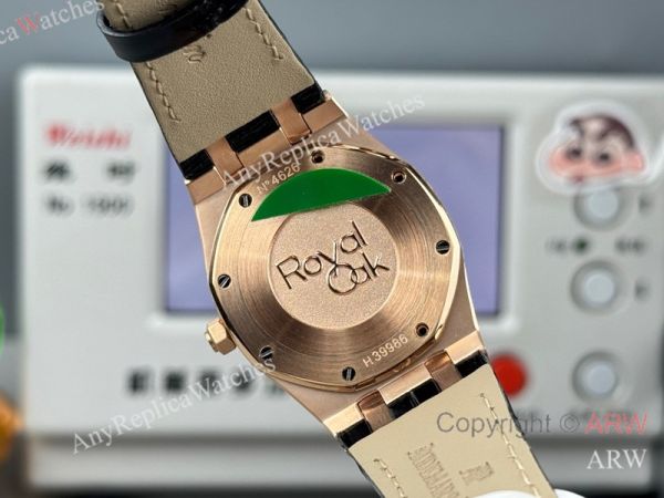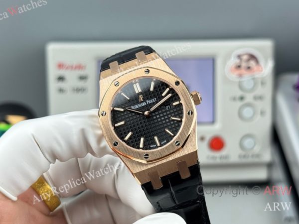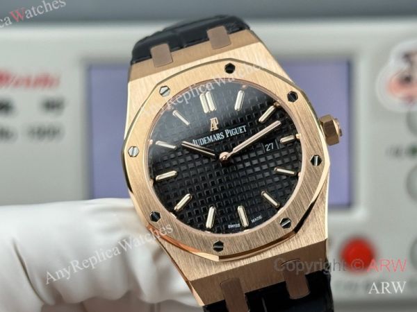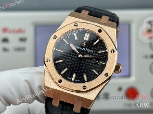 High Quality Replica AUDEMARS PIGUET Royal Oak Black Leather Strap Black Grande Tasserie Grid Pattern Face Dial Rose Gold Hexagonal Screw Fixed Case Watch 33mm