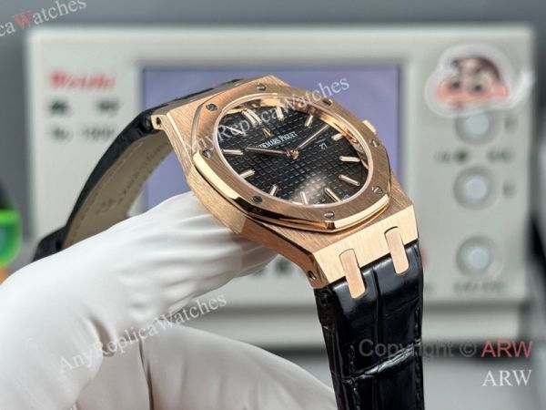 Replica AUDEMARS PIGUET Royal Oak Black Leather Strap Black Grande Tasserie Grid Pattern Face Dial Rose Gold Hexagonal Screw Fixed Case Watch 33mm