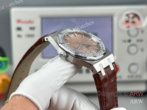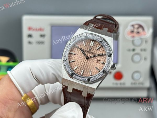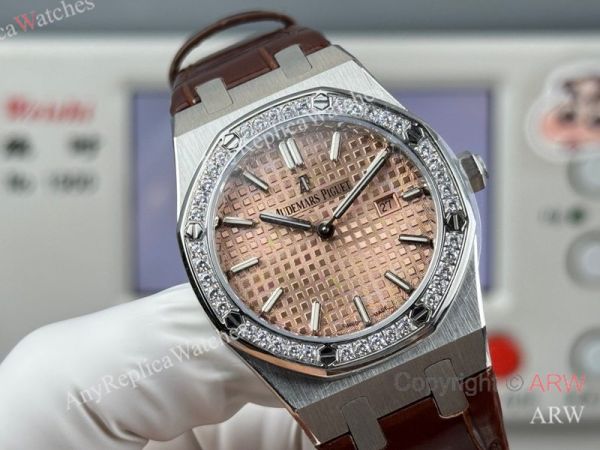 High Quality Replica AUDEMARS PIGUET Royal Oak Brown Leather Strap Silver Grande Tasserie Grid Pattern Face Dial Silver Stainless Steel Diamond Inlaid Case Watch 33mm