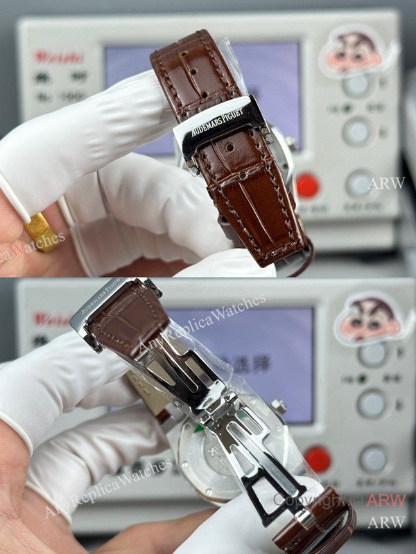 Replica AUDEMARS PIGUET Royal Oak Brown Leather Strap Silver Grande Tasserie Grid Pattern Face Dial Silver Stainless Steel Diamond Inlaid Case Watch 33mm