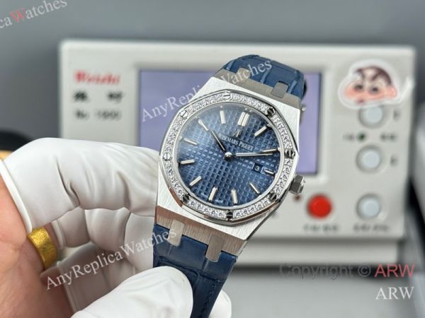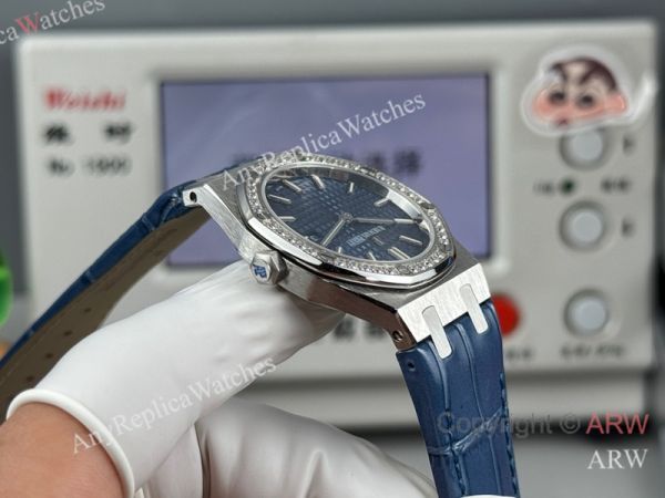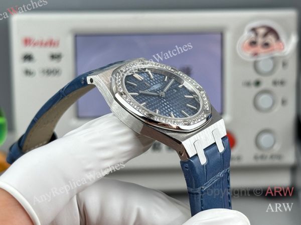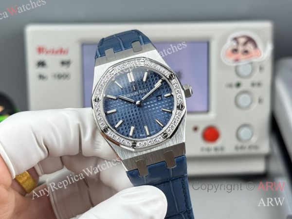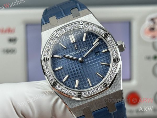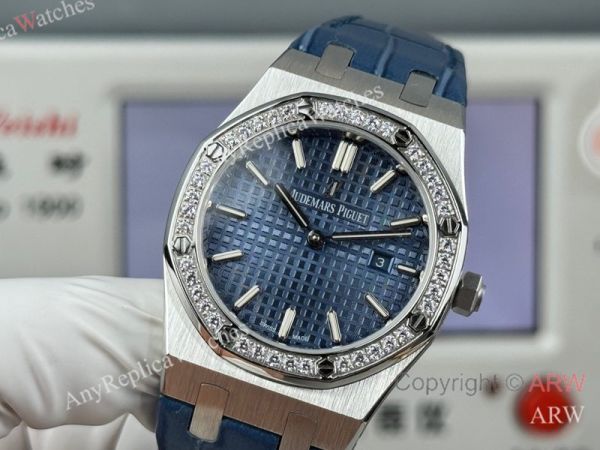 High Quality Replica AUDEMARS PIGUET Royal Oak Dark Blue Leather Strap Dark Blue Grande Tasserie Grid Pattern Face Dial Silver Stainless Steel Diamond Inlaid Case Watch 33mm