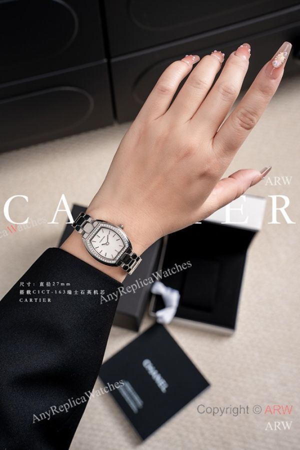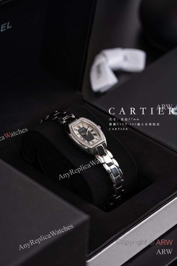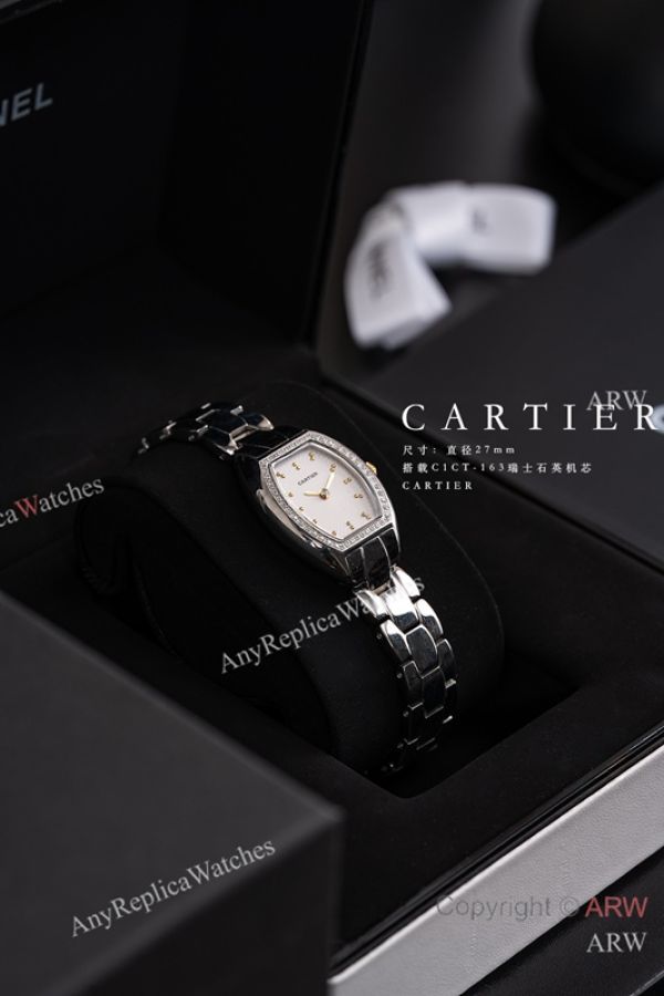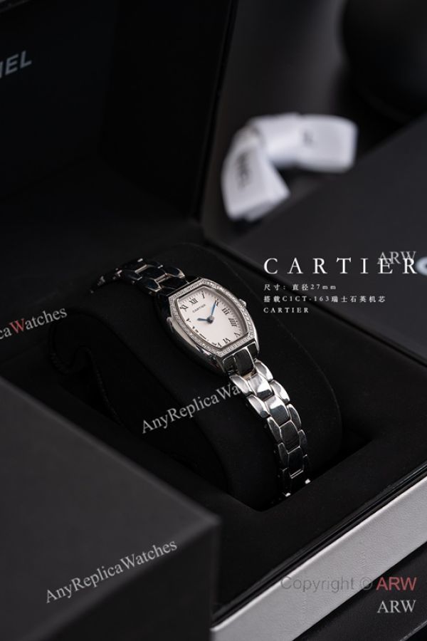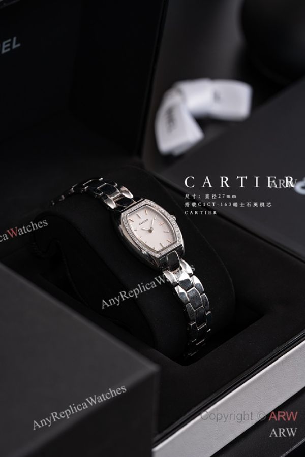 Replica CARTIER Tonneau Collection Silver Stainless Steel Bracelet White Face Dial Stainless Steel Diamond Inlaid Barrel Shaped Integrated Case Watch 27mm