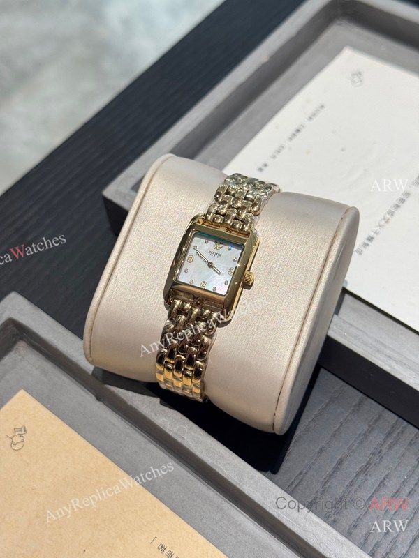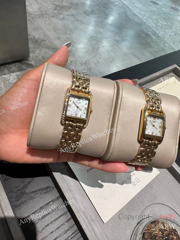 High Quality Replica HERMES CAPE COD Gold 316 Stainless Steel Bracelet Mother-Of-Pearl White Face Dial Stainless Steel Diamond Inlaid Case Watch 23x23mm