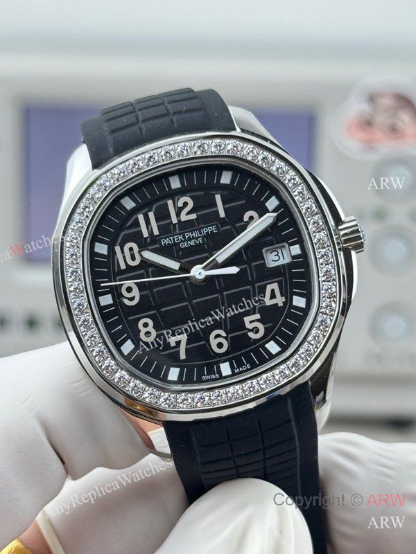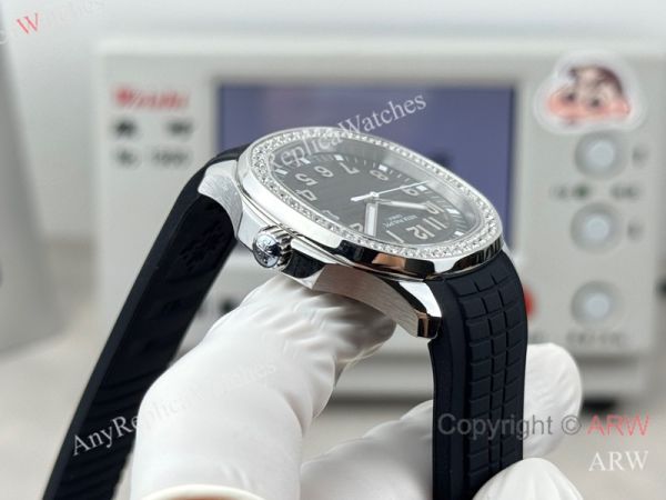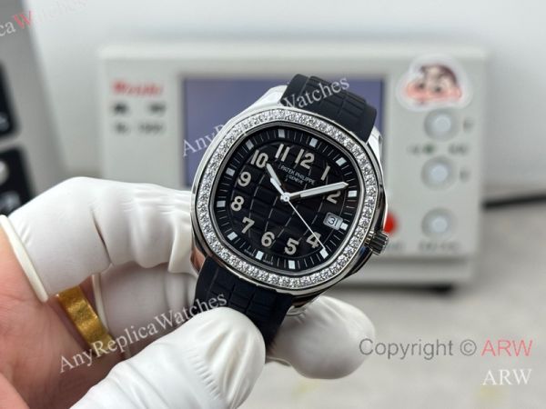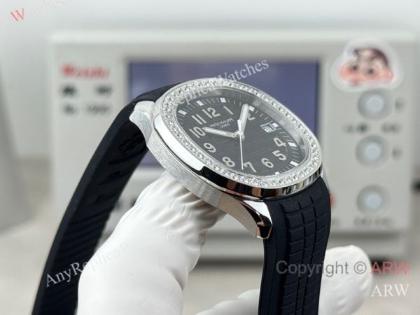 High Quality Replica PATEK PHILIPPE Aquanaut Luce Black Integrated Composite Strap Black Embossed Pattern Face Dial 48 Diamonds Inlaid Round Octagonal Case Watch 38mm