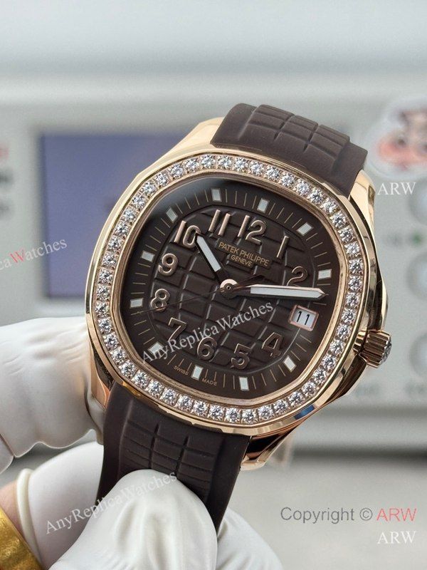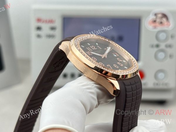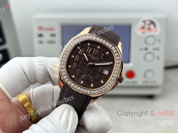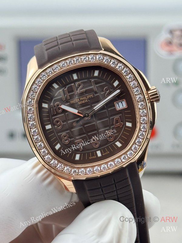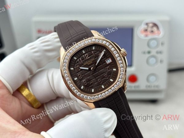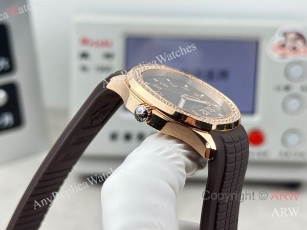 High Quality Replica PATEK PHILIPPE Aquanaut Luce Brown Integrated Composite Strap Brown Embossed Pattern Face Dial 48 Diamonds Inlaid Round Octagonal Case Watch 38mm