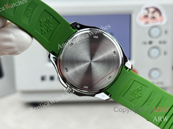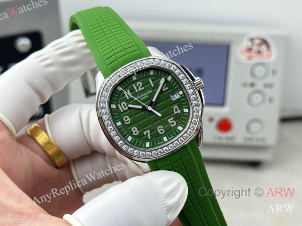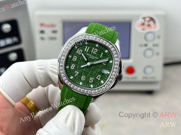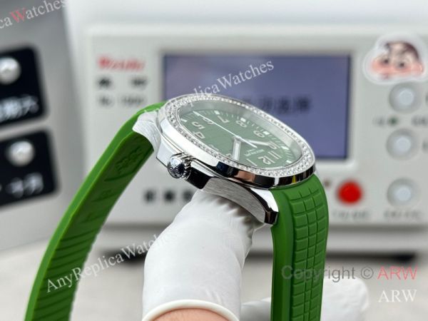 High Quality Replica PATEK PHILIPPE Aquanaut Luce Green Integrated Composite Strap Green Embossed Pattern Face Dial 48 Diamonds Inlaid Round Octagonal Case Watch 38mm