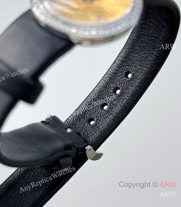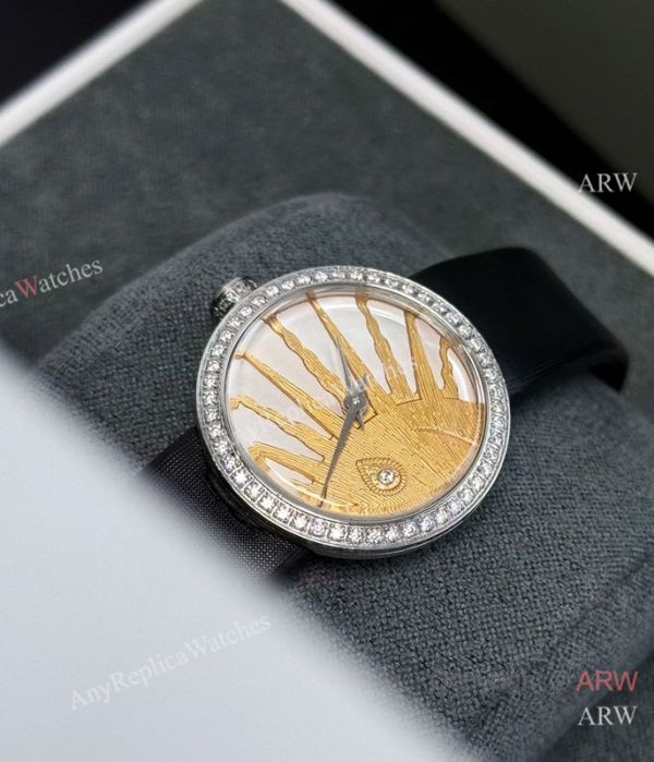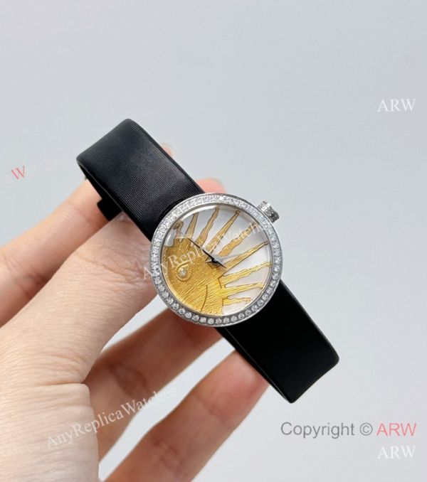 Replica DIOR LA D DE DIOR ROSE CÉLESTE Black Strap Gold-Carved Sun With Nine Rays Pearl Mother-of-pearl Face Dial Diamond-Inlaid Silver-Tone Case Watch 25mm