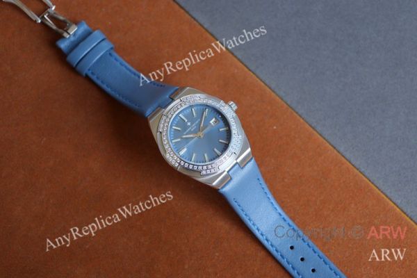 High Quality Replic VACHERON CONSTANTIN New Overseas Collection Watch Blue Leather Strap Blue Face Dial 78 Round-Cut Swarovski Crystals Inlaid Stainless Steel Case Watch 33mm
