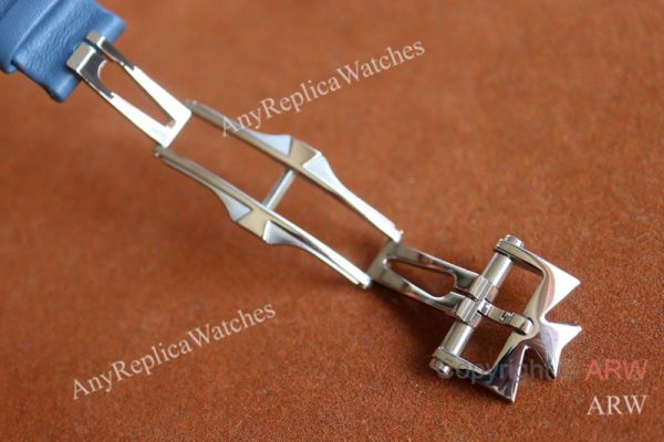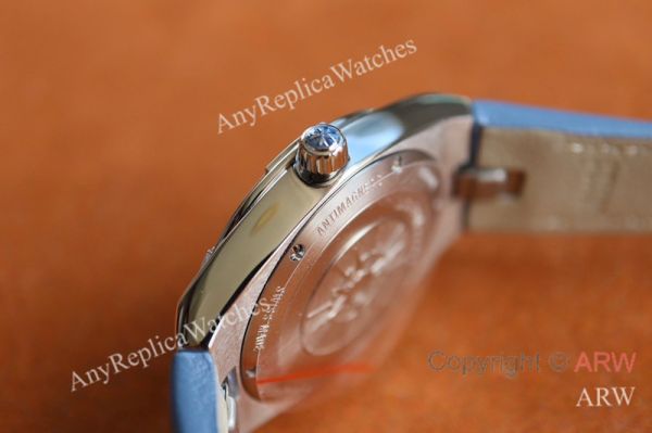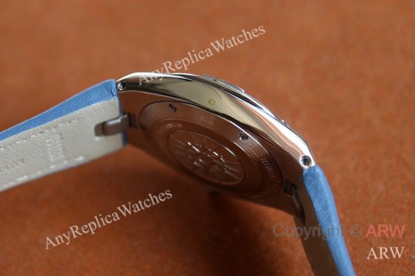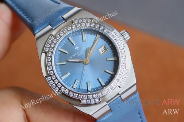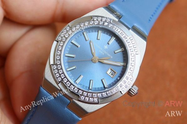Replic VACHERON CONSTANTIN New Overseas Collection Watch Blue Leather Strap Blue Face Dial 78 Round-Cut Swarovski Crystals Inlaid Stainless Steel Case Watch 33mm