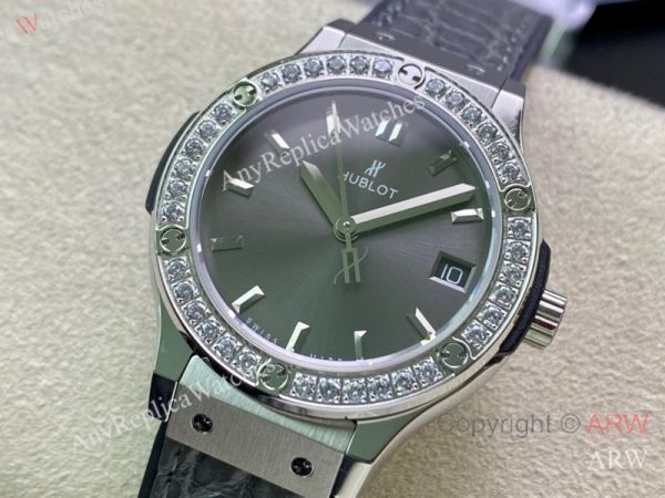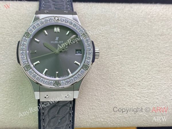 High Quality Replica HUBLOT Classic Fusion Gray Crocodile Leather Strap Satin Finish Face Dial Stainless Steel With Diamond-Inlaid Bezel Case Watch 33mm