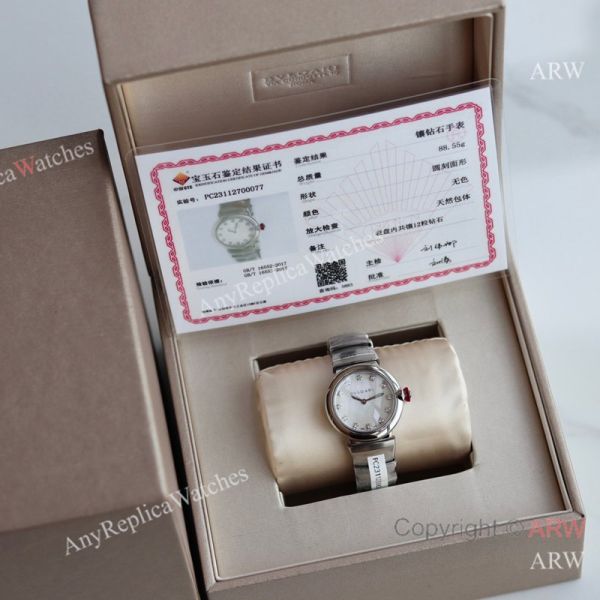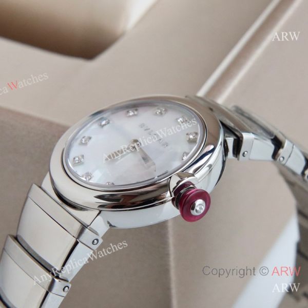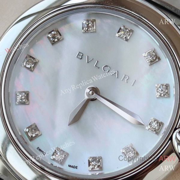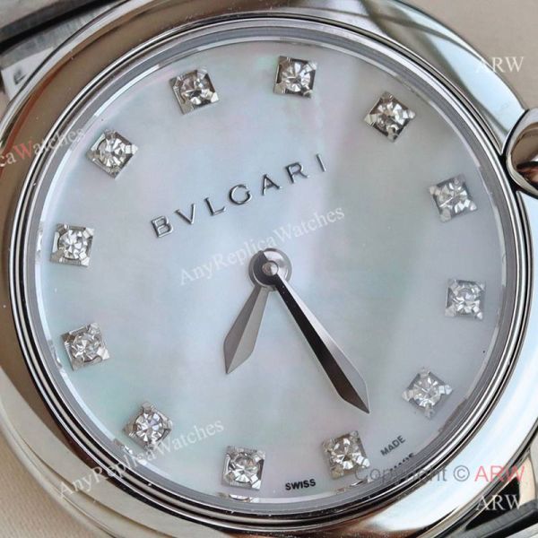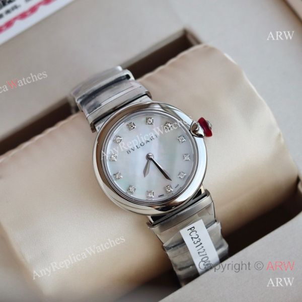 High Quality Replica BVLGARI LVCEA Silver Stainless Steel Strap White Mother-of-Pearl Face Dial Silver 904L Stainless Steel Case Watch 28mm