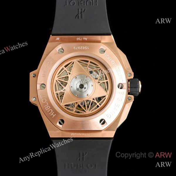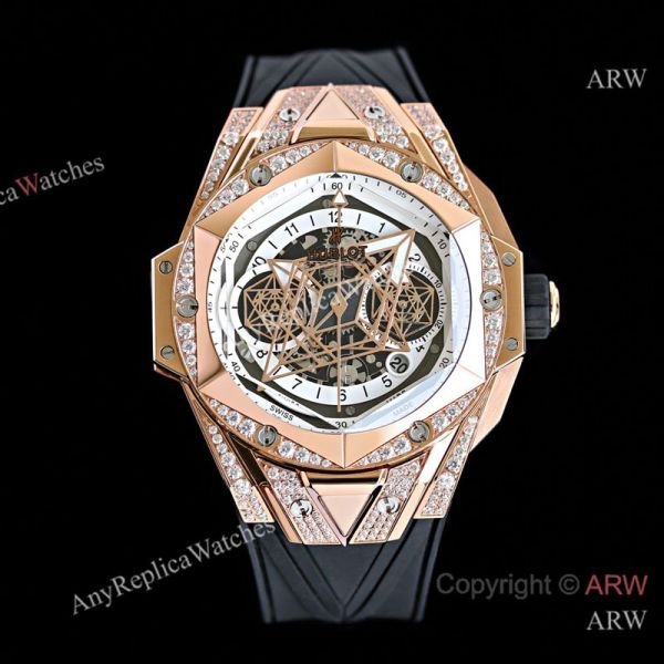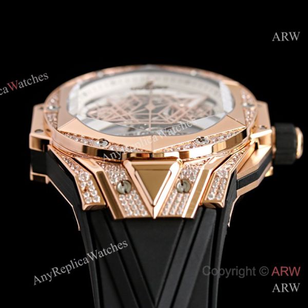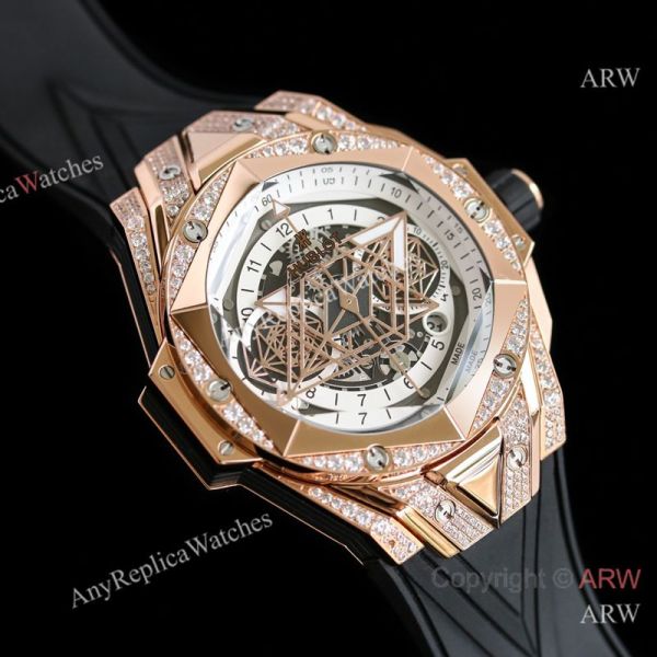 High Quality Replica HUBLOT BIG BANG SANG BLEU II Black Fluororubber Strap White Skeletonized Geometric Face Dial Titanium With Diamond-Set Case Watch 45mm