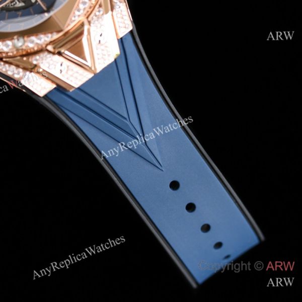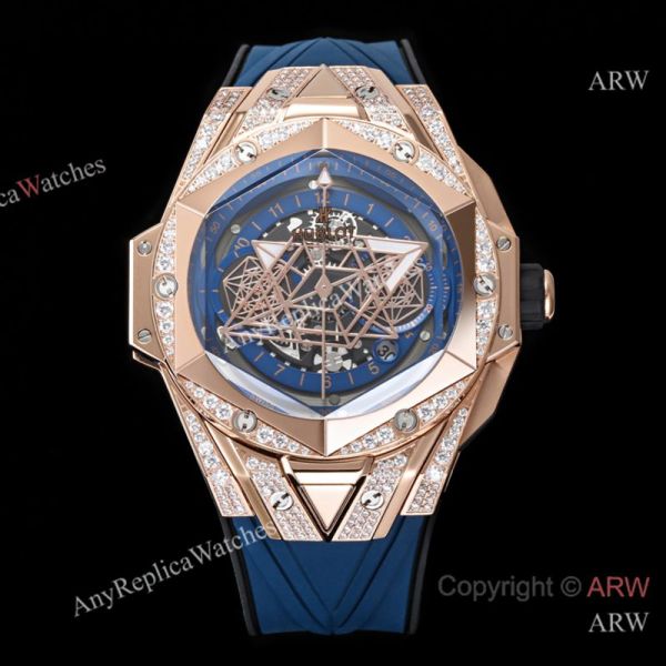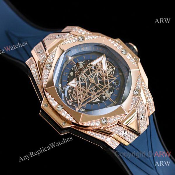 High Quality Replica HUBLOT BIG BANG SANG BLEU II Dark Blue Fluororubber Strap Dark Blue Skeletonized Geometric Face Dial Titanium With Diamond-Set Case Watch 45mm