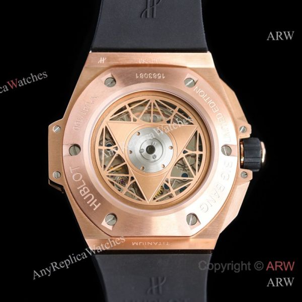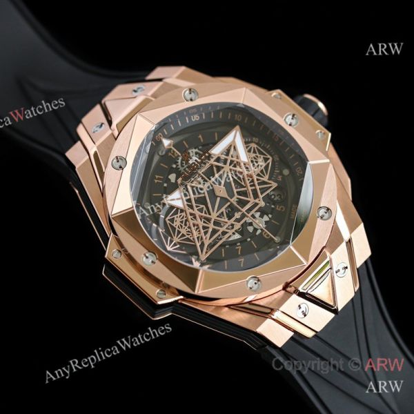 Replica HUBLOT BIG BANG SANG BLEU II Black Fluororubber Strap Black Skeletonized Geometric Face Dial Titanium With Diamond-Set Case Watch 45mm