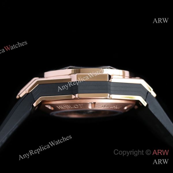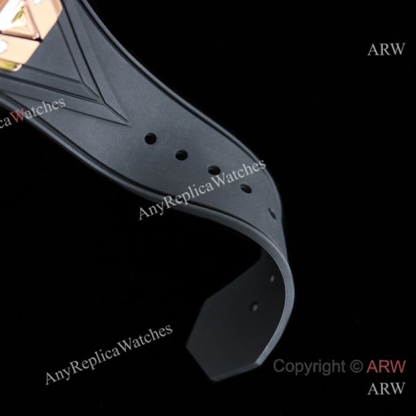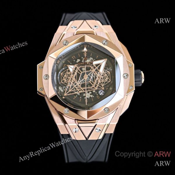High Quality Replica HUBLOT BIG BANG SANG BLEU II Black Fluororubber Strap Black Skeletonized Geometric Face Dial Titanium With Diamond-Set Case Watch 45mm