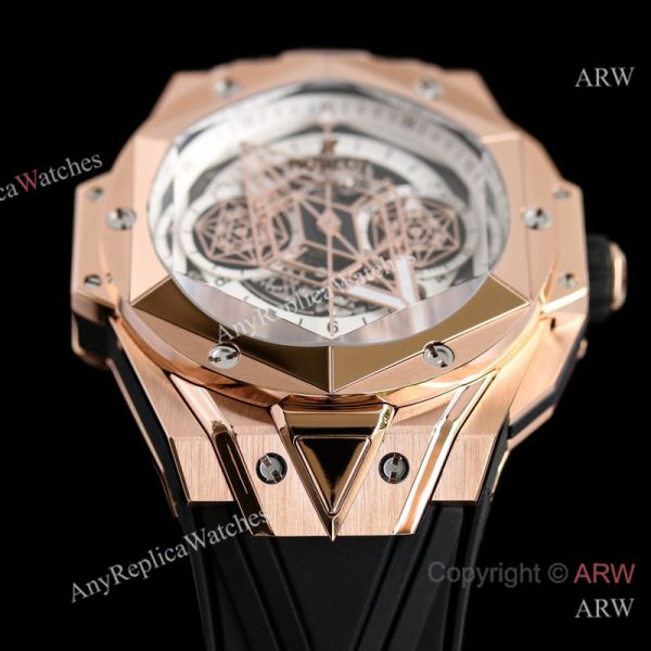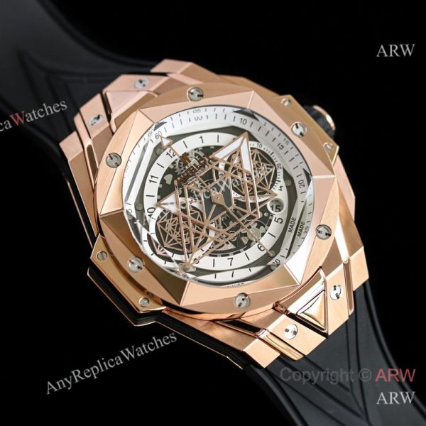 Replica HUBLOT BIG BANG SANG BLEU II Black Fluororubber Strap White Skeletonized Geometric Face Dial Titanium With Diamond-Set Case Watch 45mm