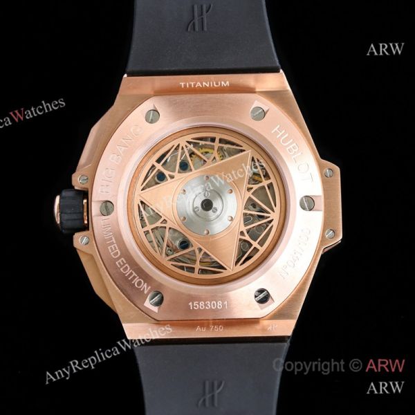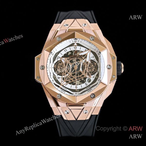 High Quality Replica HUBLOT BIG BANG SANG BLEU II Black Fluororubber Strap White Skeletonized Geometric Face Dial Titanium With Diamond-Set Case Watch 45mm