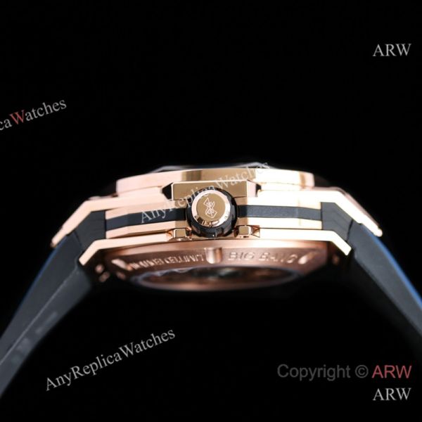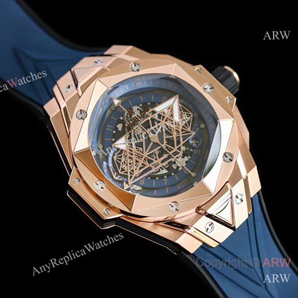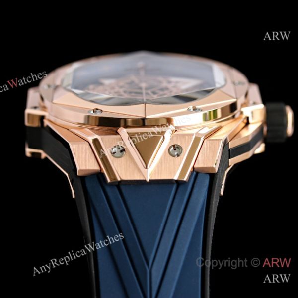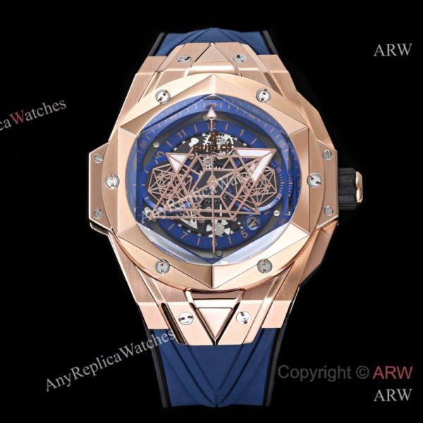 High Quality Replica HUBLOT BIG BANG SANG BLEU II Dark Blue Fluororubber Strap Dark Blue Skeletonized Geometric Face Dial Titanium With Diamond-Set Case Watch 45mm