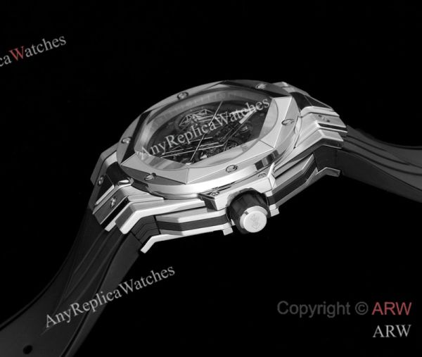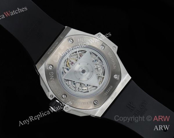 High Quality Replica HUBLOT BIG BANG SANG BLEU II Black Fluororubber Strap Black Skeletonized Geometric Face Dial Titanium With Diamond-Set Case Watch 45mm