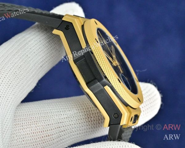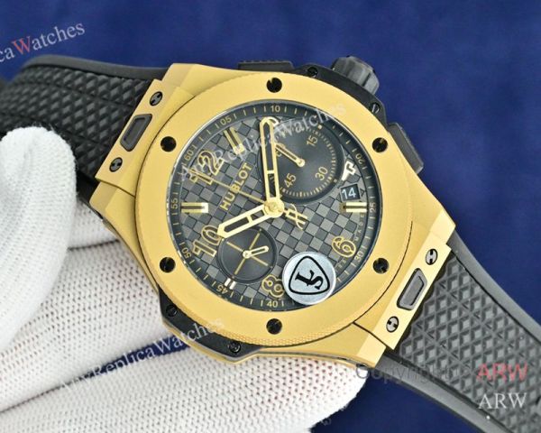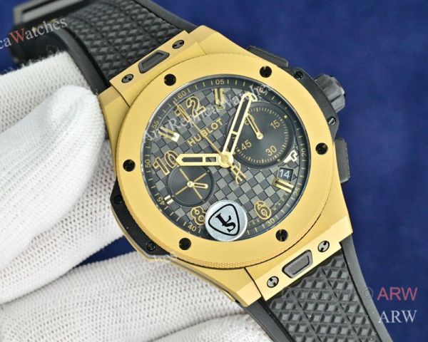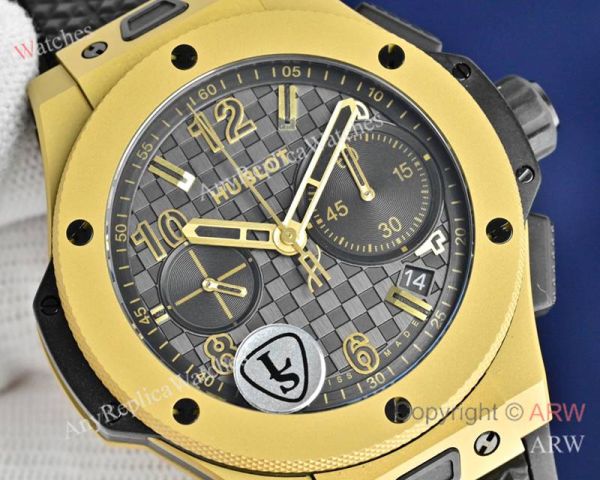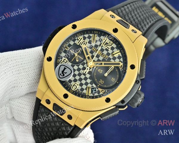 Replica HUBLOT BIG BANG 20TH ANNIVERSARY Black Imported Fluororubber Strap Black Checkered Face Dial Gold Case Watch 43mm