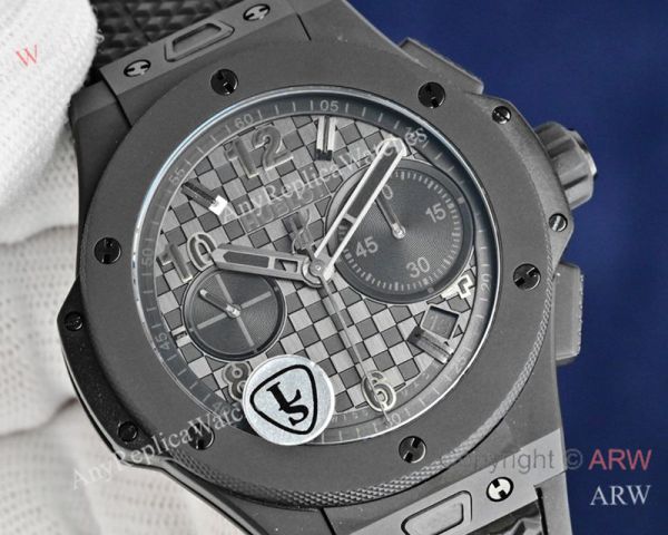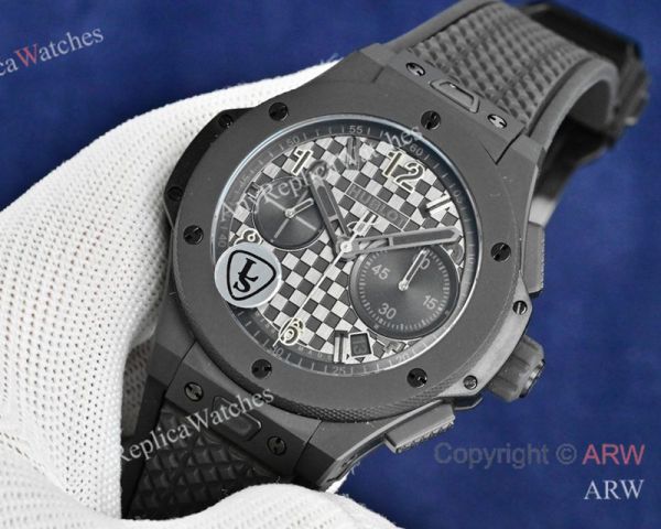 Replica HUBLOT BIG BANG 20TH ANNIVERSARY Black Imported Fluororubber Strap Black Checkered Face Dial Gold Case Watch 43mm