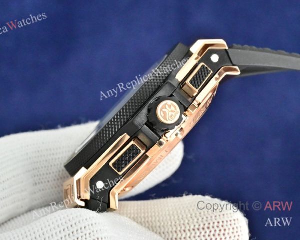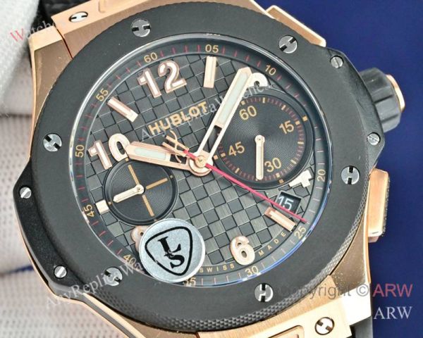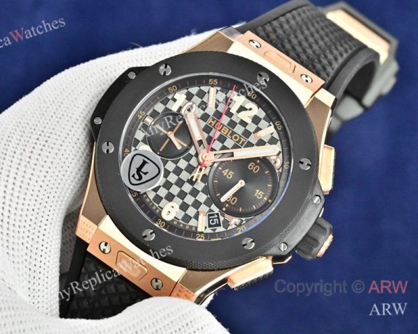Replica HUBLOT BIG BANG 20TH ANNIVERSARY Black Imported Fluororubber Strap Black Checkered Face Dial Gold Case Watch 43mm