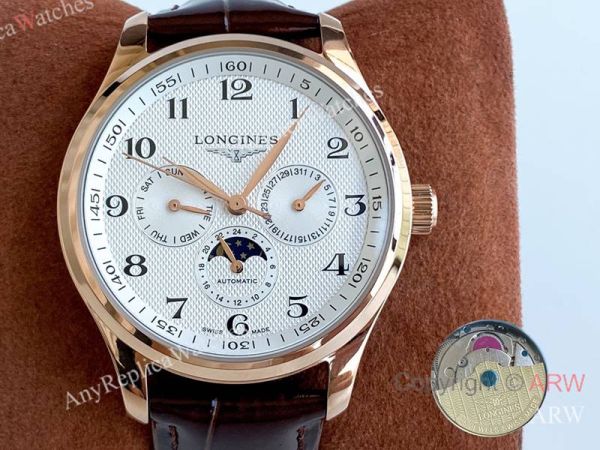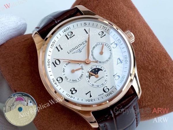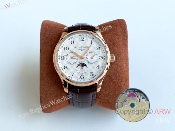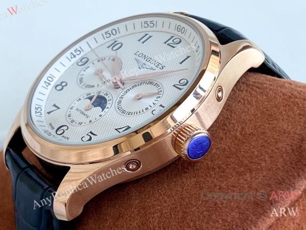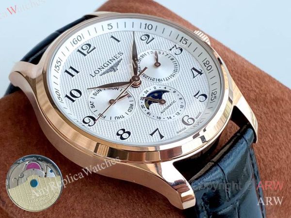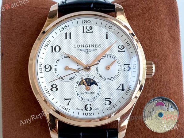High Quality Replica LONGINES Men's Watch Black Genuine Leather Strap White Face Dial Rose Gold Case Watch 40*12mm