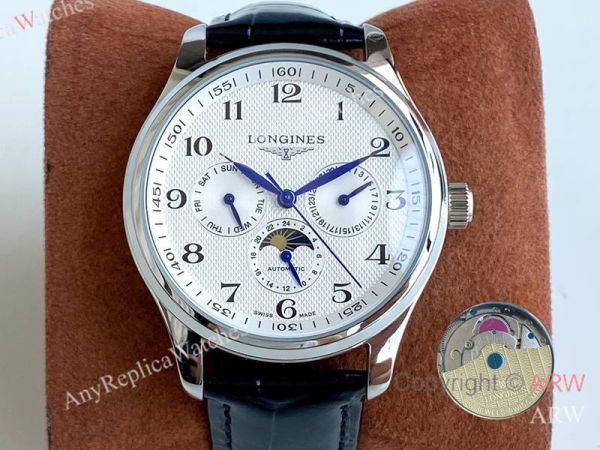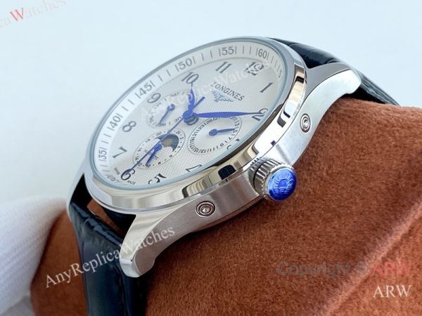 High Quality Replica LONGINES Men's Watch Black Genuine Leather Strap White Face Dial Silver Case Watch 40*12mm