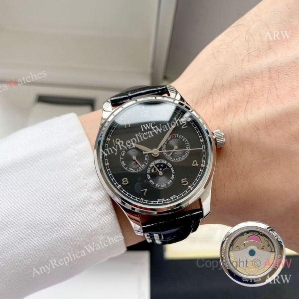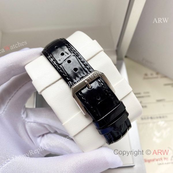 Replica IWC Black Genuine Leather Strap Black Face Dial Silver Stainless Steel Case Watch 42mm