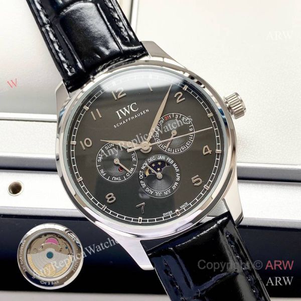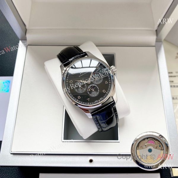 High Quality Replica IWC Black Genuine Leather Strap Black Face Dial Silver Stainless Steel Case Watch 42mm