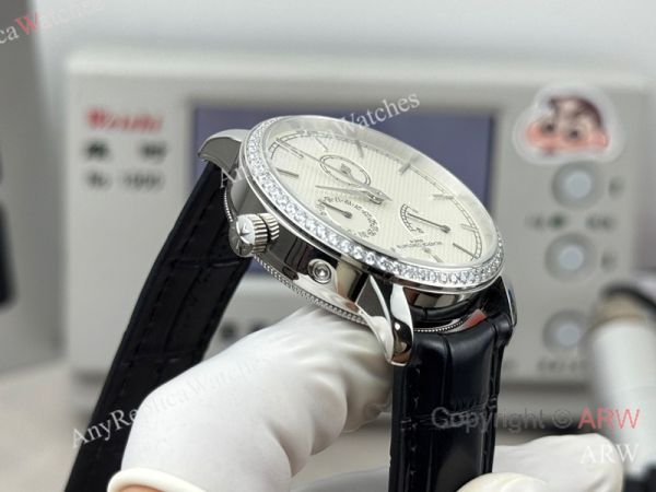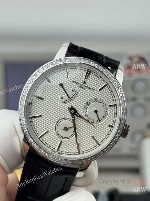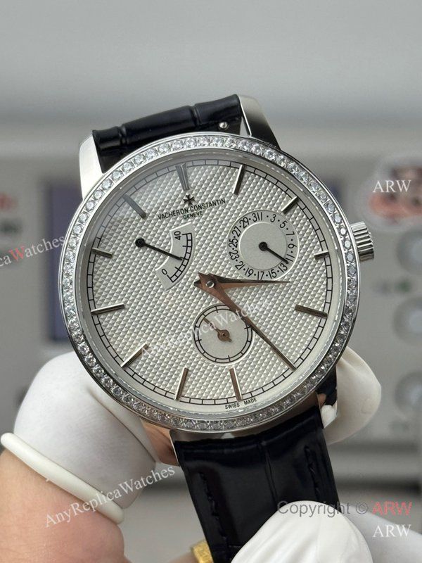 Replica VACHERON CONSTANTIN Traditionnelle Black Leather Strap White Face Dial White Diamonds Stainless Steel Case Watch